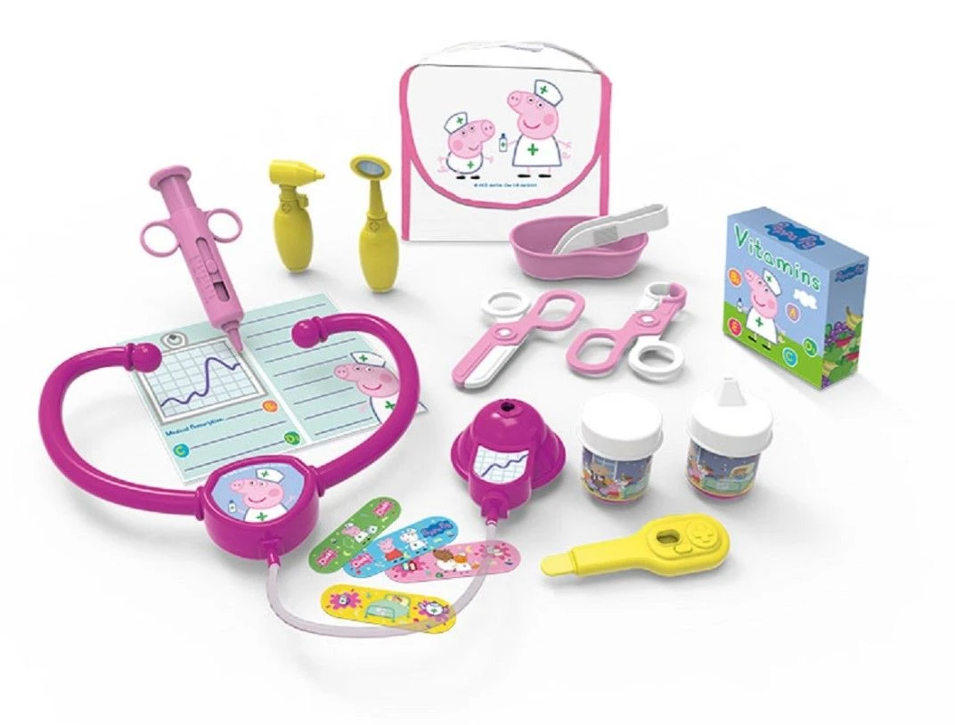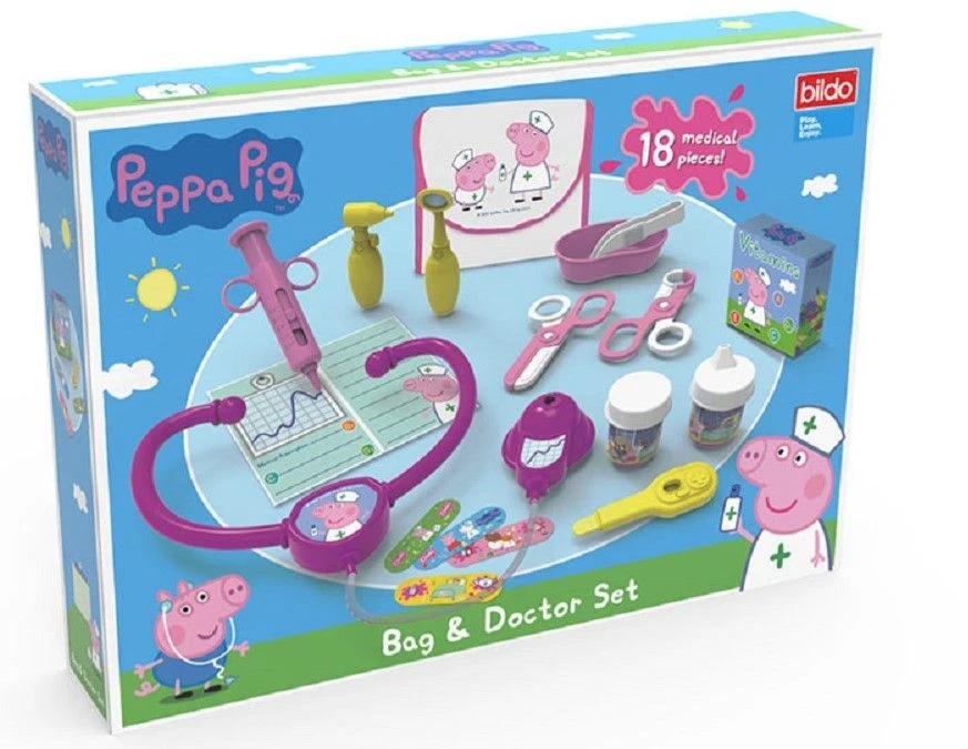 Bildo Παιδικά Εργαλ.Σετ Ιατρικά Τσαντάκι Και Σετ Ιατρικά Τσάντα και σετ γιατρού πέππα το γουρουνάκι που περιλαμβάνει 18 ιατρικά εργαλεία.