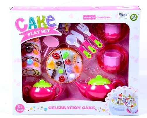 Σετ κουζινικών Cake Playset-Τούρτα Γενεθλίων. Περιλαμβάνει 2 τσαγιερά, 2 σετ κουπες-πιατάκια, τούρτα σε 4 κομμάτια, 4 γλυκάκια, μαχαίρι-πιρουνι-κουτάλι, μεγάλο μαχαίρι, κεράκια, happy birthday ταμπελάκι.