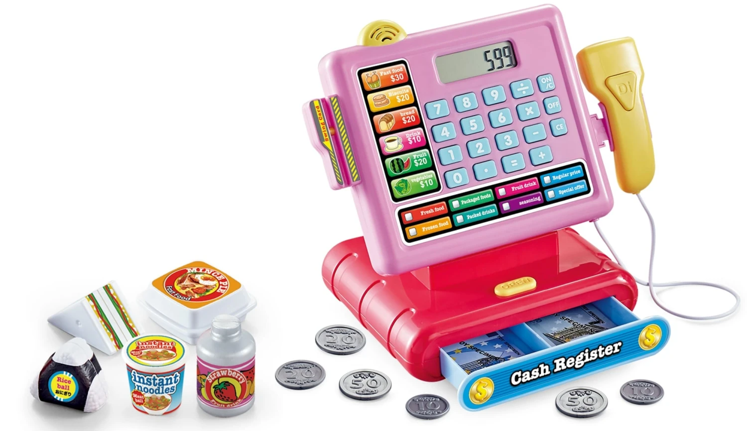 Ταμειακή Μηχανή Small Store Cashier. Tαμειακή μηχανή με οθόνη LCD και διάφορα αξεσουάρ όπως πλαστική πιστωτική κάρτα, χαρτονομίσματα και κέρματα, είδη φαγητού και άλλα. **Οι μπαταρίες δεν περιλαμβάνονται.