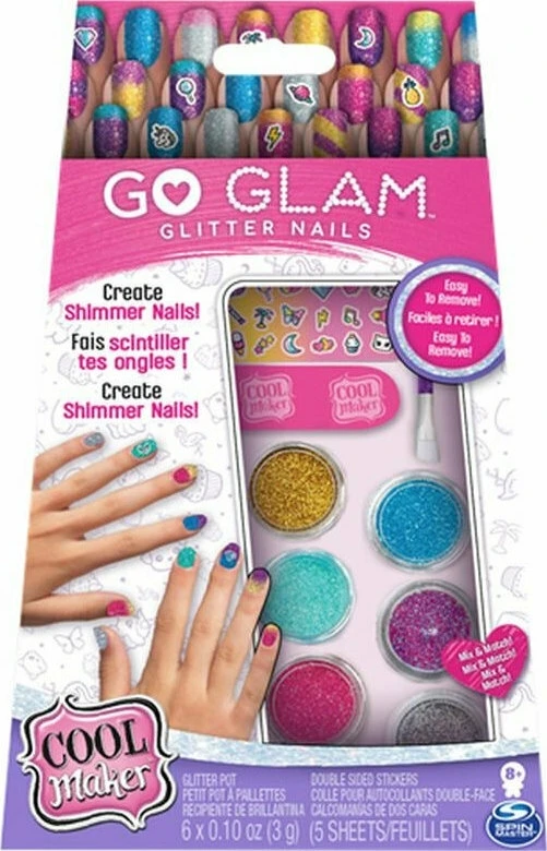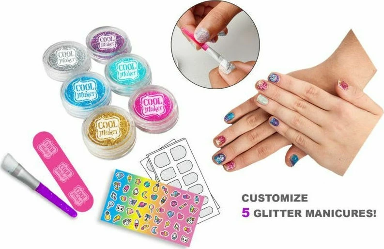 Cool Maker Go Glam Λαμπερά Νύχια Περιλαμβάνει: 6 χρώματα γκλίτερ 5 φύλλα με αυτοκόλλητα νυχιών 1 φύλλο με διακοσμητικά στοιχεία 1 λίμα νυχιών 1 πινέλο 1 φύλλο οδηγιών