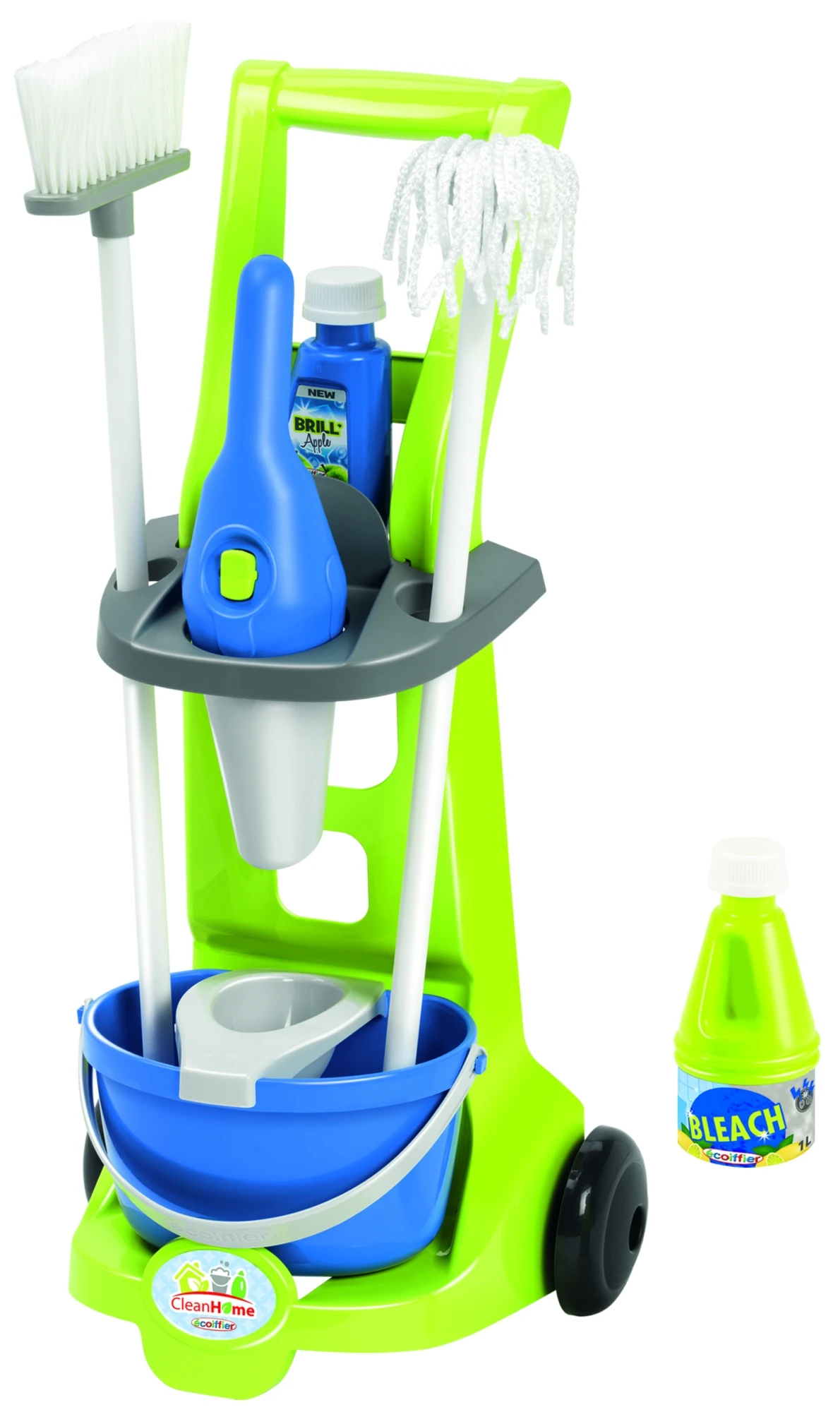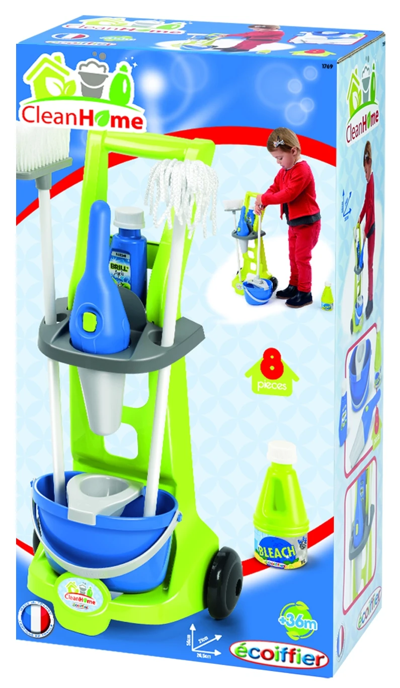 Ecoiffier Clean Home Παιδικό Σετ Τρόλευ Καθαρισμού Ένα καροτσάκι με όλα τα απαραίτητα αξεσουάρ για ένα καθαρό σπίτι: μια σφουγγαρίστρα και ένας κουβάς, μια σκούπα, μια φορητή ηλεκτρική σκούπα και 2 φιάλες προϊόντων καθαρισμού. Διαστάσεις: 26,5 x 21 x 56 εκ. Περιλαμβάνει 8 κομμάτια.