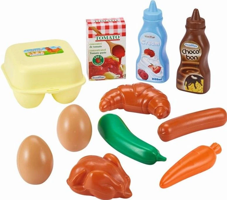 Διάφορα τρόφιμα σε ένα δίχτυ. Με αυτό το σετ έχετε όλα τα υλικά για το τέλειο πρωινό. Περιέχει 2 αυγά, κοτόπουλο, λουκάνικο, καρότο, αγγούρι, κρουασάν, σάλτσα ντομάτας και γαρνιτούρες. Ιδανικό και ως εξοπλισμός καταστήματος ή ως συμπλήρωμα στην παιδική κουζίνα.