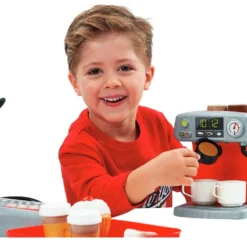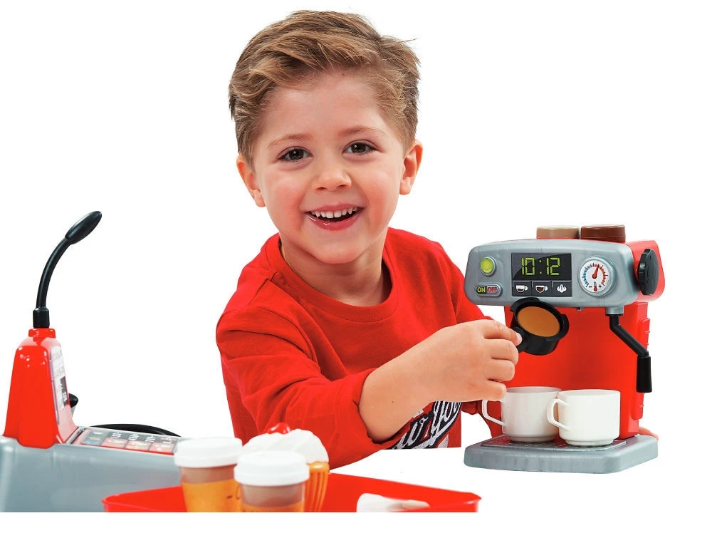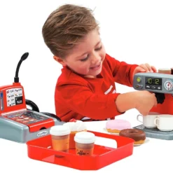 Ecoiffier Κουζινικά Σετ Ταμείο – Καφετέρια Αποτελείται από μια μηχανή καφέ, 3 ποικιλίες καφέ, μια ταμειακή μηχανή με μικρόφωνο, πιστωτική κάρτα, χρήματα και ένα δίσκο για να σερβίρετε τον καφέ μαζί με γλυκά.
