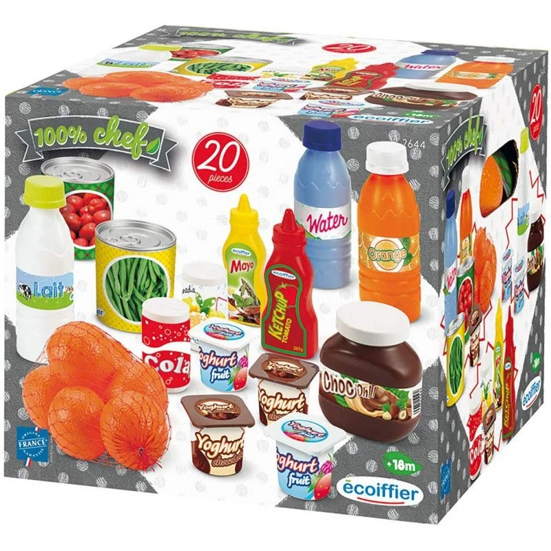Ecoiffier Παιδικό Κουζινικό Πακέτο με Τρόφιμα Πλήρες πακέτο με τρόφιμα που περιλαμβάνει: 1 μπουκάλι νερό, 1 μπουκάλι χυμό πορτοκαλιού, 1 μπουκάλι γάλα, κέτσαπ, μαγιονέζα, 2 κονσέρβες, 4 γιαούρτια, 2 σόδες και 6 πορτοκάλια σε δίχτυ. Ιδανικό για τον εξοπλισμό της κουζίνας ή του παντοπωλείου σας.