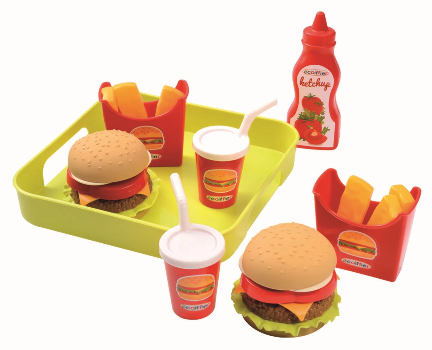 Ecoiffier Παιδικο σετ φαγητού, δίσκος με χάμπουργκερ! Περιλαμβάνει: •Δίσκο •2 χάμπουργκερ •2 κουτιά αναψυκτικό •2 κουτάκια με πατάτες τηγανητές •1 κέτσαπ