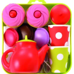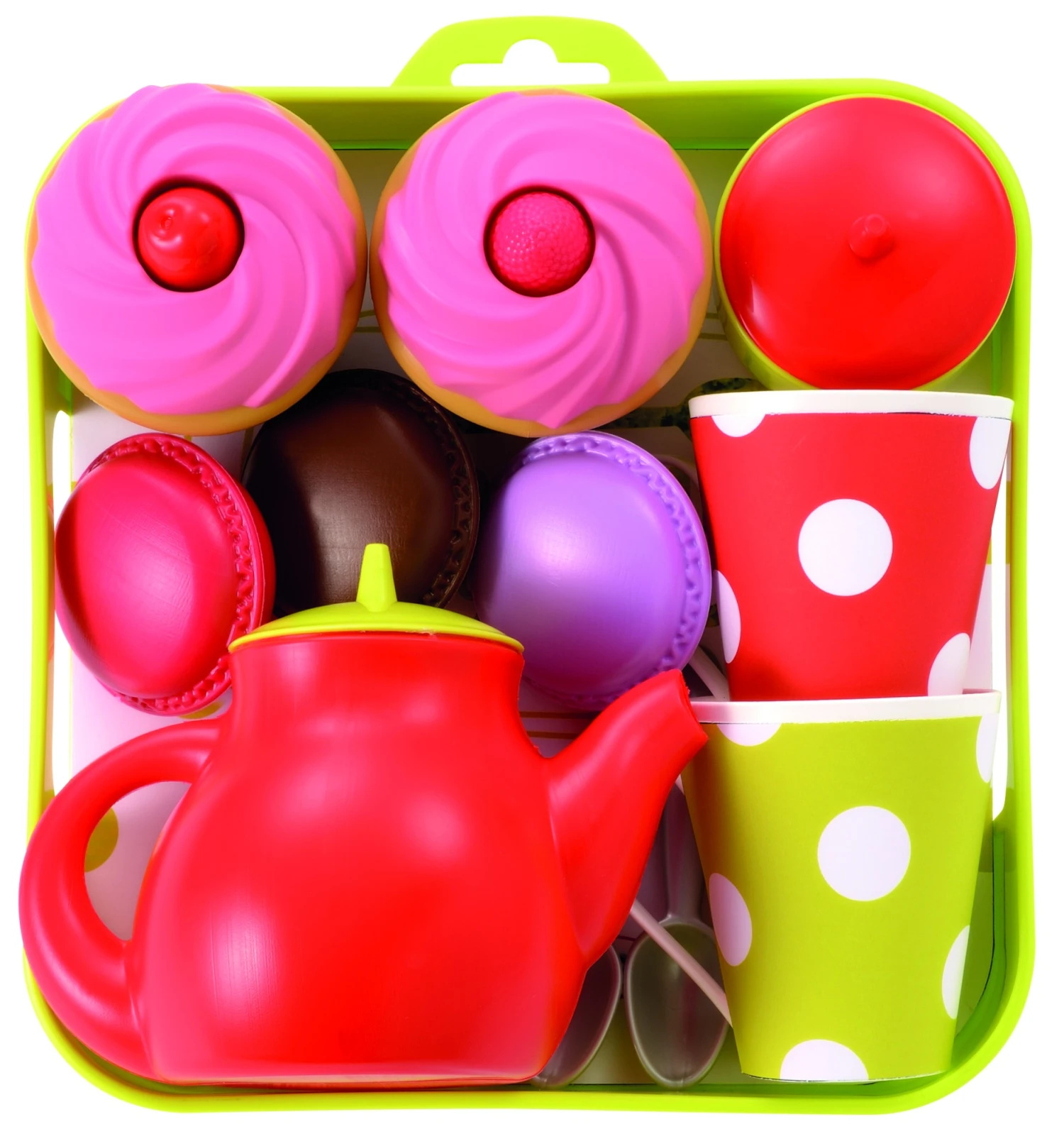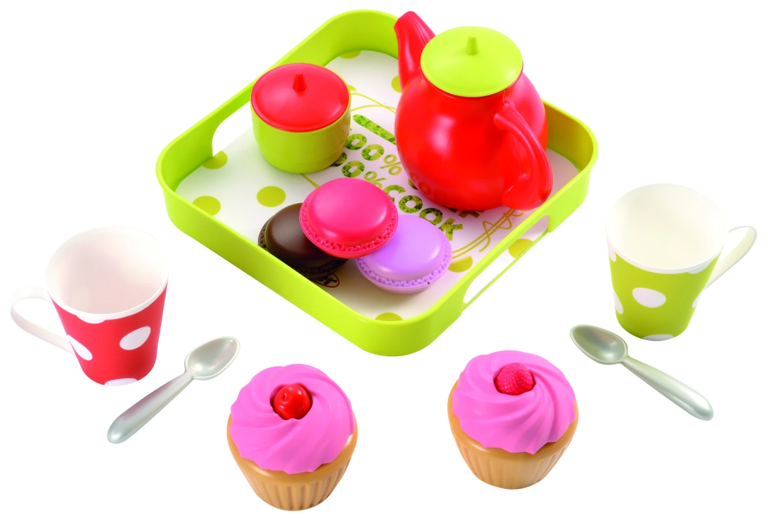 Ecoiffier παιδικό σετ τσαγιού με γλυκά. Ένας θαυμάσιος τρόπος να ενθαρρύνετε το παιχνίδι ρόλων! Δίσκος με τσαγιέρα, ζαχαριέρα, 2 κούπες, 2 cupcakes, 3 μακαρον, 2 κουταλάκια.