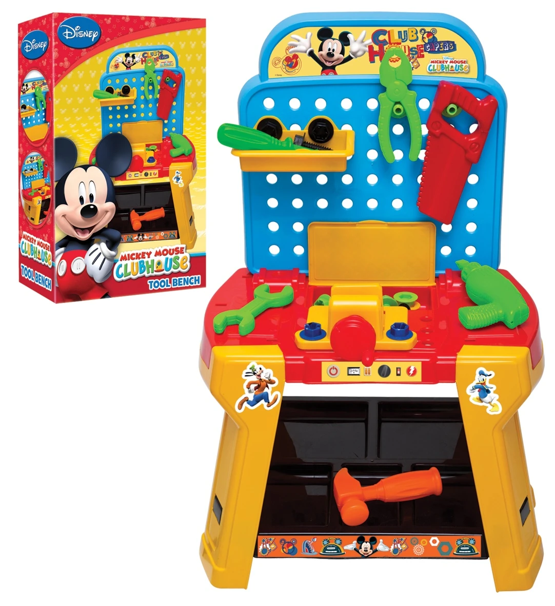 Παιδικός πλαστικός πάγκος εργαλείων mickey mouse. Περιέχει 33 τεμάχια. Περιλαμβάνει: πριόνι, τανάλια ,σφυρί, βίδες και άλλα αξεσουαρ.