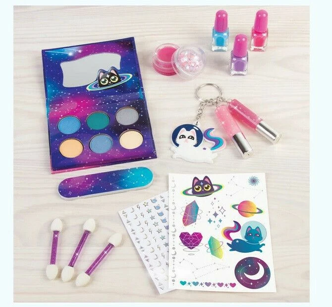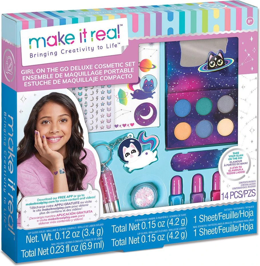 Make It Real- Girl On The Go: Deluxe Cosmetic Set Το σετ περιέχει: παλέτα με σκιές ματιών και καθρέπτη, 3 μικροσκοπικά πινέλα μακιγιάζ, μπρελόκ, 2 lip gloss, τατουάζ, 3 χρώματα βερνίκια νυχιών με βάση το νερό, αυτοκόλλητα νυχιών, λίμα νυχιών, οδηγίες χρήσης. Για ηλικίες από 8+ ετών.